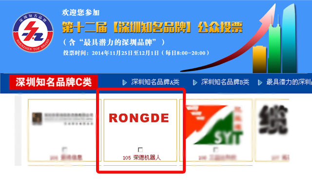 2014年,深圳市榮德機器人科技有限公司作為國家級高新技術(shù)企業(yè),廣東省名牌產(chǎn)品,成功入選第十二屆“深圳知名品牌”評選活動,并定于2014年11月25日至12月1日(每天8:00-20:00)進行公眾投票,投票結(jié)果直接決定公司是否被評選上。所以特請各位朋友幫忙榮德公司投上一票。謝謝!投票具體規(guī)則如下: