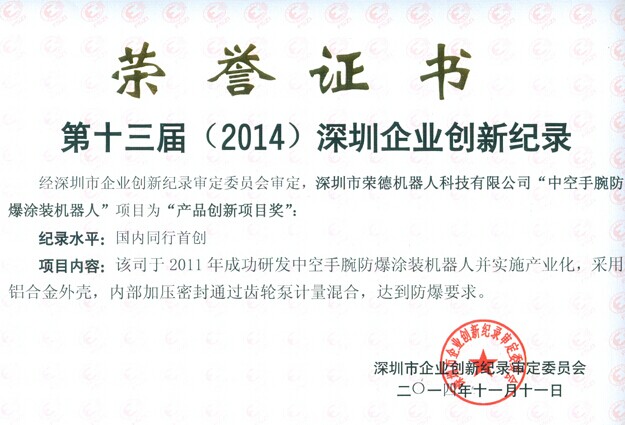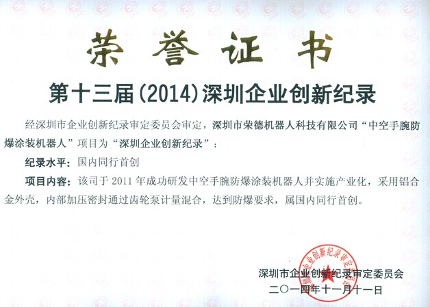 近日,由深圳市企業(yè)創(chuàng)新紀(jì)錄審定委員會(huì)為深圳市榮德機(jī)器人科技有限公司頒發(fā)了“第十三屆(2014)深圳企業(yè)創(chuàng)新紀(jì)錄”的榮譽(yù)證書(shū),榮德公司自主研發(fā)制造的“中空手腕防爆涂裝機(jī)器人”榮獲“產(chǎn)品創(chuàng)新項(xiàng)目獎(jiǎng)”以及“深圳企業(yè)創(chuàng)新紀(jì)錄”兩項(xiàng)大獎(jiǎng),紀(jì)錄水平為“國(guó)內(nèi)同行首創(chuàng)”。