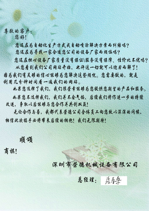 無論合作與否,我都代表榮德公司全體員工向您致以深深的問候,相信此次握手必將帶來后續(xù)的擁抱!我們無限期待!