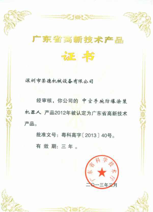 日前,廣東省科技廳公示了獲得“2012年廣東省高新技術(shù)產(chǎn)品證書”的企業(yè),深圳市榮德機(jī)器人科技自主研發(fā)的噴涂機(jī)器人赫然在目。