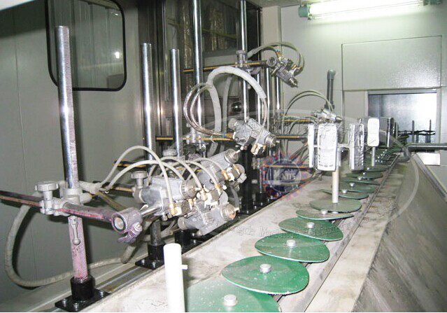 Ω靜電自動(dòng)噴涂設(shè)備,是將輸送軌彎曲成Ω形,工件圍繞圓盤式靜電噴槍周圍通過(guò),并在噴涂過(guò)程中自轉(zhuǎn),圓盤噴槍上下移動(dòng)進(jìn)行自動(dòng)噴涂。由于工件圍繞圓盤噴槍通過(guò),工件相對(duì)噴槍的時(shí)間較長(zhǎng),允許輸送鏈速度較高,故生產(chǎn)效率較高。圓盤噴槍上下移動(dòng)行程及速度,可依據(jù)工件外形來(lái)調(diào)節(jié),提高涂膜質(zhì)量。