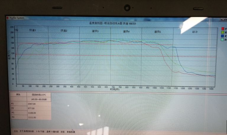 a噴涂生產(chǎn)線測(cè)溫 預(yù)熱設(shè)定120℃ ,烘烤5分鐘后溫度在90-120左右 ,沒(méi)有在±5的溫度范圍內(nèi),烘干線5節(jié)烤箱都設(shè)定170℃ ,只有 234節(jié)烤箱烤箱基本能在160-175這個(gè)溫度范圍內(nèi),沒(méi)有在總烘烤時(shí)間設(shè)定15分鐘, 需有12分鐘在165-175這個(gè)時(shí)間段內(nèi) b線測(cè)溫第一二節(jié)烤箱。